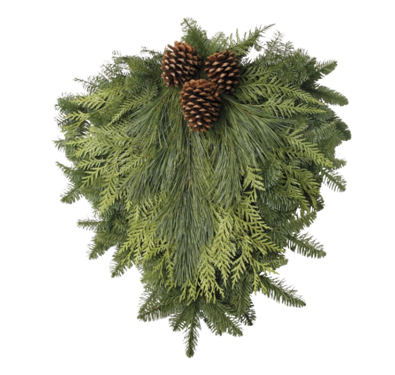 Bring the beauty of the forest to your home with this handcrafted evergreen door swag. Made with fresh noble fir, cedar, juniper, white pine, and boxwood, and accented with natural pinecones for a rustic, elegant touch. Designed in a flat, triangular shape, it’s a beautiful alternative to a wreath — perfect for decorating doors, mantels, or covered porches.